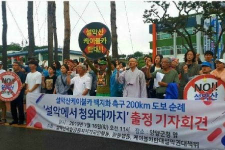 시민단체 50여 명이 강원 양양군청 앞에서 기자회견을 갖고 도보 순례를 시작했다. (사진=유선희 기자)