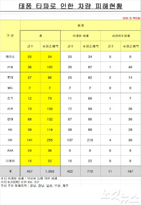 태풍 '타파'로 인한 차량 피해현황(손해보험협회 제공)