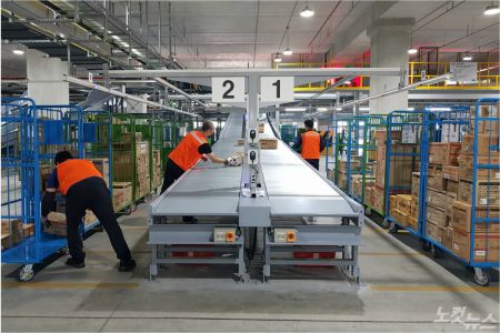 25일 본격 가동에 들어간 다이소 부산허브센터에서 작업자들이 상품을 분류하고 있다. (사진=부산CBS 박진홍 기자)