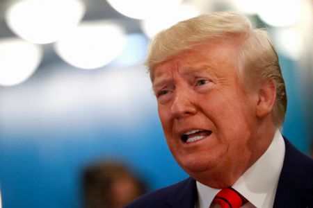 도널드 트럼프 미국 대통령이 24일(현지시간) 제74회 유엔 총회에 참석하기 위해 뉴욕 유엔본부에 들어서면서 취재진의 질문에 답하고 있다. 트럼프 대통령은 이날 트위터에 올린 글에서 지난 7월 우크라이나 대통령과의 통화 당시 대선 맞수인 조 바이든 전 부통령에 대한 '조사 외압'을 행사했다는 의혹과 관련, 통화 녹취록 공개를 지시했다고 밝혔다. (사진=연합뉴스)