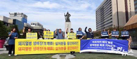 동물권단체 케어와 한국동물보호연합 회원들이 26일 오후 서울 광화문광장에서 아프리카돼지열병과 관련해 돼지들이 비인도적인 살처분을 당하고 있다며 인도적 살처분을 촉구하는 기자회견을 열고 구호를 외치고 있다.