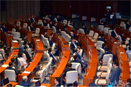 반면 여당인 더불어민주당 의원들은 야유하는 야당 의원들을 향해 "그만 좀 하라"는 고함이 나왔고, 인사말 후에는 박수를 치기도 했다.