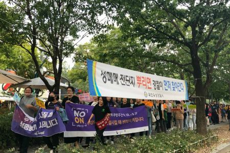 참가자들은 '여성폭력 STOP! 성매매 알선·구매 OUT!'을 주제로 거리 행진과 '성산업카르텔 터뜨리기' 퍼포먼스 등 캠페인을 전개하고 시민들과 함께 하는 프로그램도 진행했다.