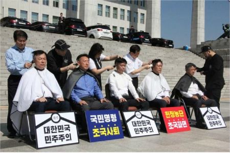 지난 18일 국회 본청에서 이만희, 김석기, 최교일, 장석춘 등 경북지역 한국당 의원들이 집단 삭발을 하고 있다(사진=자료사진)