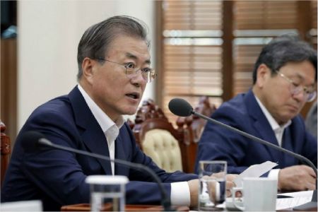 문재인 대통령이 지난달 30일 오전 청와대 여민관에서 조국 법무부 장관의 업무보고 후 발언하고 있다.(사진=연합뉴스)