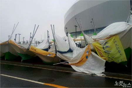 3일 커피축제가 열리고 있는 강릉아레나 입구에 마련된 수십 동의 행사부스들이 강풍에 나뒹굴고 있다. (사진=유선희 기자)