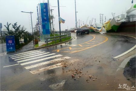 한편 이날 강릉커피축제가 열리는 강릉아레나 입구 앞에는 수십 동의 행사부스들이 강풍이 뒤집어진 채 위태롭게 나뒹굴고 있었다. 주변 도로 곳곳도 나뭇가지가 쓰러지고 토사물로 뒤덮여 온통 진흙과 모랫바닥이었다.