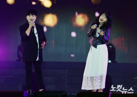 작품하나 김정아와 공민수가 4일 오후 경기도 고양 일산 호수공원 노래하는 분수대 특설무대에서 열린 ‘2019 대학가요제’ 전야제에서 열창을 하고 있다.