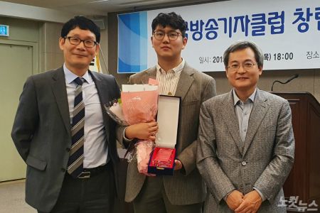제주CBS 고상현 기자(가운데)가 BJC 보도상을 수상했다. CBS 손근필 미디어본부장과 보도국 김학일 사회부장이 함께 축하했다.