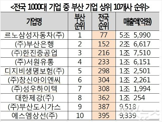 전국 100대 기업에 유일하게 들어간 부산 부동의 매출 1위 기업 르노삼성마저 1년새 매출이 17%나 하락하며 순위가 급락했고, 1000대 기업에 포함된 부산 대표기업 34곳의 매출을 모두 합쳐도 전국 비중이 1.4%에 불과해 제 2도시의 위상을 무색하게 했다.