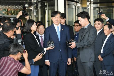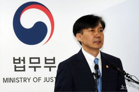 조국 법무부 장관이 14일 오전 경기도 정부과천청사에서 브리핑을 갖고 검찰의 특별수사 대상을 구체화하고 서울, 대구, 광주 등 3개청을 제외한 나머지 검찰청의 특수부를 형사부로 전환하는 내용 등을 담은 개혁방안을 추진한다고 밝힌 후 취재진의 질문을 받기 위해 대기하고 있다. 황진환기자