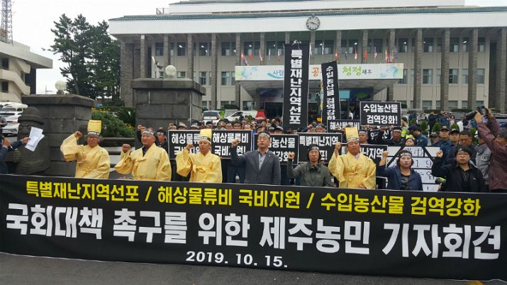 전국농민회총연맹 제주도연맹 등 도내 농민단체들은 국감장 밖에서 해상운송비 지원과 특별재난지역 선포를 위한 국회의원들의 결단을 요구했다.