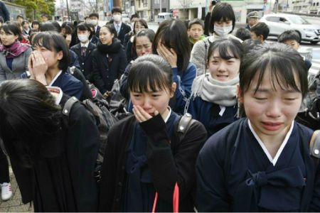 지난 3월 일본 후쿠오카(福岡)지법 고쿠라(小倉)지부가 규슈(九州)조선중고급학교 졸업생 68명이 일본 정부를 상대로 750만엔(약 7천500만원)의 손해배상을 청구한 소송에서 원고의 청구를 기각하자 법원 주변에 있던 이 학교의 여학생들이 눈물을 흘리는 모습. (사진=연합뉴스)