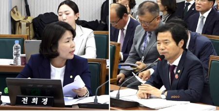 15일 전남대학교 국정감사장에서 설전을 벌인 전희경 국회의원과 김승환 전북교육감. (사진= 전남대 제공)