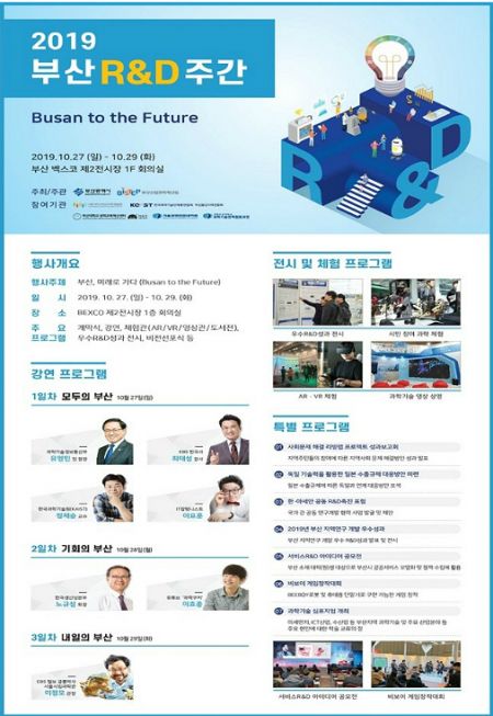 부산시 연구개발(R&D) 예산 투입 사업 중 우수사례를 선정하고 시상하는 '2019년 부산 지역연구개발 최우수성과' 발표회 및 전시와 더불어 지역 청년들이 주도적으로 도시 공공 서비스 아이디어를 발굴하는 '서비스 연구개발 기반 신 공공서비스 아이디어 공모전' 결과 발표가 진행된다.