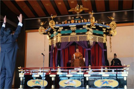이날 즉위의식은 지난 5월 1일 일본왕실에서 내려오는 보물인 청동검 등 이른 바 삼종신기(三種の神器)를 넘겨받고 왕위를 계승한 나루히토 일왕의 즉위를 대내외에 선언하는 의식이다.