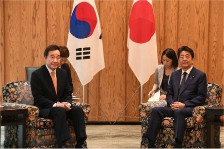 이낙연 국무총리가 24일 오전 일본 도쿄(東京) 총리관저에서 아베 신조(安倍晋三) 총리와 악수하고 있다. (사진제공=연합뉴스)