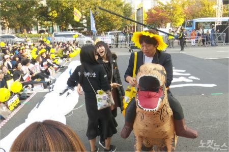 이날 ‘공룡을 탄 남자’, ‘마시멜로 남자’를 비롯해 드론을 이용한 중계 등 이전 집회에서는 볼 수 없었던 재미있는 풍경들이 보였습니다.