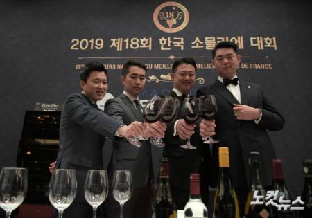 28일 오전 서울 중구 밀레니엄 서울 힐튼에서 프랑스 농식품부 주최, 소펙사 코리아 주관으로 열린 '2019 제18회 한국 소믈리에 대회'에서 참가자들이 포즈를 취하고 있다.