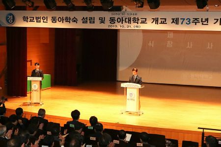 동아대학교(총장 한석정)는 31일 오전 11시 승학캠퍼스 리인홀에서 교직원과 학생, 동문 등 300여 명이 참석한 가운데 '학교법인 동아학숙 설립 및 동아대학교 개교 73주년 기념식'을 개최했다.