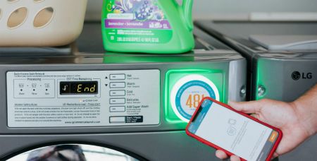 워시라바의 모바일 세탁 플랫폼을 이용해 LG전자 세탁기를 사용하는 모습(사진=LG전자 제공)