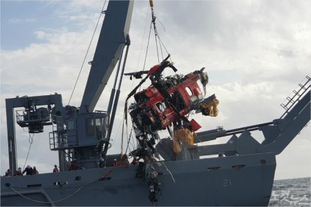 이어 청해진함은 안전해역으로 이동한 뒤, 낮 12시50분쯤 헬기를 끌어 올리는 인양작업을 진행했다. 수색 당국은 이날 오후부터 기상 여건이 악화될 것으로 예보되자 동체를 인양하는 쪽으로 결정한 것으로 알려졌다.