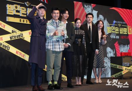 8일 오전 서울 강남구 CGV압구정에서 열린 넷플릭스 오리지널 시리즈 ‘범인은 바로 너 시즌2’ 제작발표회에 참석해 출연진이 포즈를 취하고 있다. 왼쪽부터 유재석, 김종민, 이승기, 박민영, 세훈, 세정.
