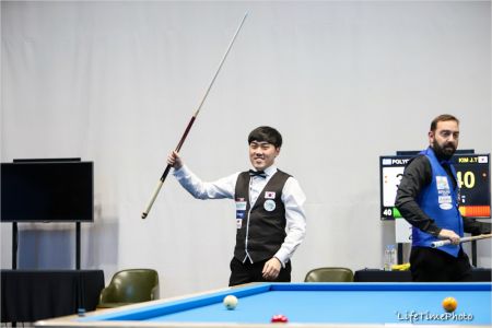 16강전에서 35위 니코스 폴리크로노폴로스(그리스)를 에버리지 2.00의 경기력을 따돌린 김준태는 8강에서 한국 선수 중 유일한 세계선수권 우승자이자 23위 최성원(부산시체육회)마저 제압했다.