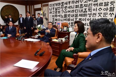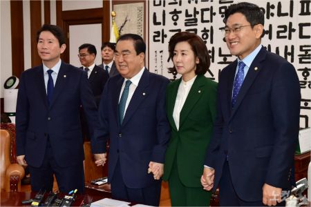 나 원내대표는 "저희는 1월 말에 부의해야 한다고 말씀드렸다. 패스트트랙은 전 과정이 불법"이라며 거듭 반대 의사를 표명했다.