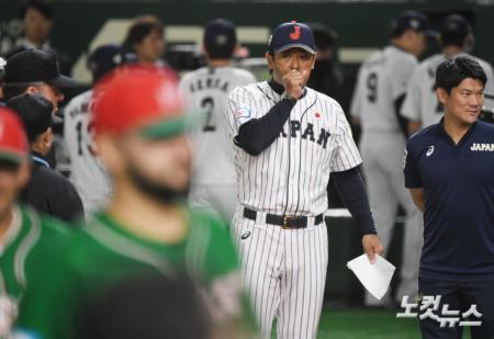 13일 오후 일본 도쿄 돔에서 열린 2019 WBSC 프리미어 12 슈퍼라운드 멕시코와 일본의 경기. 일본 이나바 아츠노리 감독이 멕시코 선수들을 바라보고 있다.