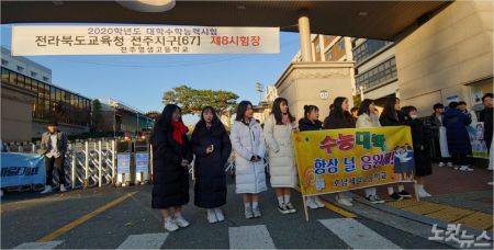 2020학년도 대학수학능력시험 전주지구(67) 제8시험장인 영생고 앞에서 후배들이 선배들의 '수능 대박'을 응원하고 있다. (사진= 남승현 기자)
