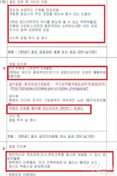 2일 차엔 올림픽 요트경기장을 비롯해 황해의 바다와 기암절벽이 어우러진 노산에서 양구리프트를 탔고 '전신마사지'를 받았다.