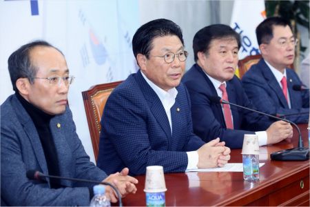 자유한국당 총선기획단장인 박맹우 사무총장(왼쪽 두번째)이 21일 국회에서 열린 전략회의에서 발언하고 있다. (사진=연합뉴스)