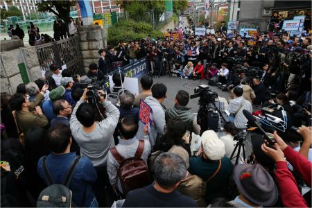 지난달 23일 오후 서울 관악구 인헌고등학교 앞에서 열린 '인헌고등학교 학생수호연합' 소속 학생들의 기자회견에 많은 보수단체 회원 및 보수 유튜버들이 기자회견을 지켜보고 있다. 학생수호연합은 일부 교사가 '편향적 정치사상'을 학생들에게 주입한다고 주장했다. (사진=연합뉴스)