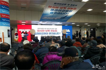 22일 오후 양양국제공항 여객터미널 2층에서'플라이강원 첫 취항'을 축하하는 행사를 진행했다. (사진=유선희 기자)