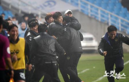 24일 오후 인천 중구 인천축구전용경기장에서 열린 하나원큐 K리그1 2019 37라운드 인천 유나이티드 FC vs상주 상무 프로축구단 경기 후반에서 인천 문창진 골에 유상철 감독 및 코칭 스태프들이 환호를 하고 있다.