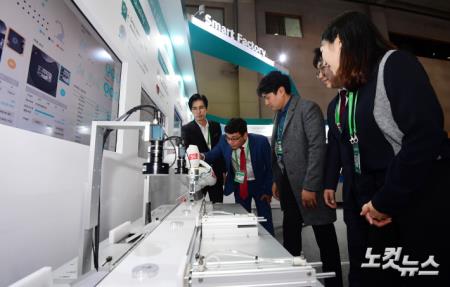 25일 오후 부산 해운대구 벡스코에서 열린 ‘한·아세안 스타트업 엑스포, ComeUp’ 에 참가한 KT 관계자들이 스마트팩토리 플랫폼과 연동돼 사람과 함께 협업하는 5G 협동로봇을 선보이고 있다.