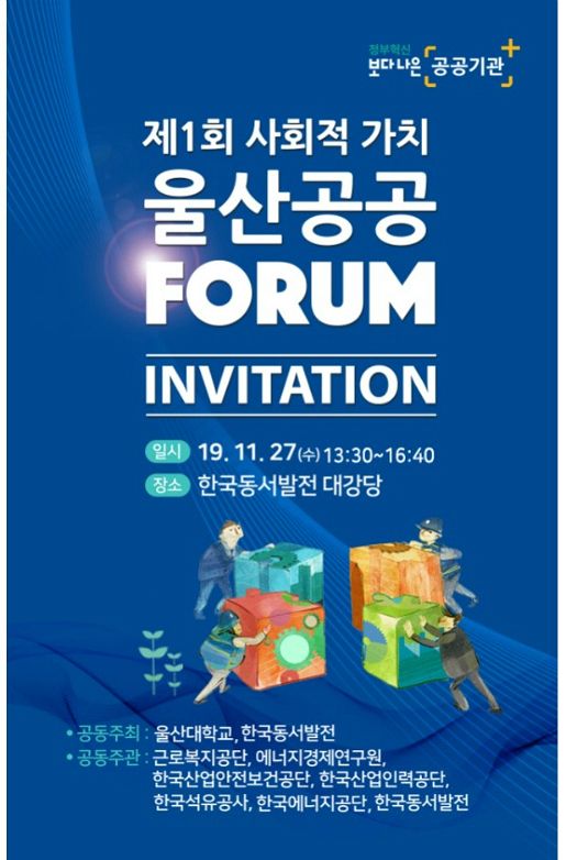 이번 포럼에서는 울산 혁신도시 공공기관들이 한 자리에 모여 공공·민간부문 협업을 통한 사회적가치 실현 사례와 방안을 공유한다.