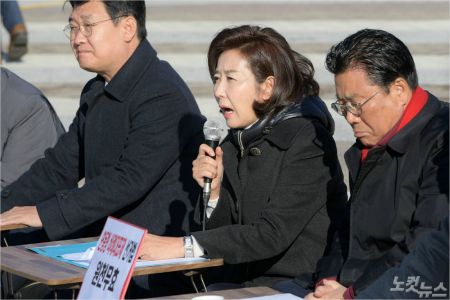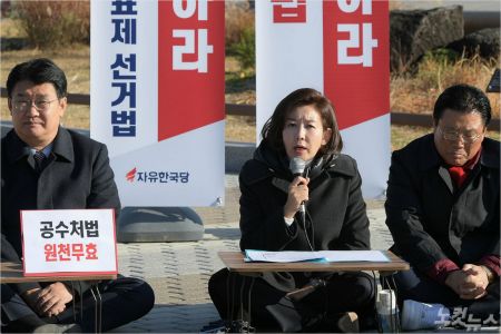 나 원내대표는 “제1야당 대표가 목숨을 건 투쟁 하고 있는데, 청와대 정무비서관은 문자 메세지 한 통으로 천막 자진철거 협박을 운운하고 있다”며 “친정권 세력의 수많은 천막은 허용하면서 추위나 막아줄 천막을 빼앗겠다는 것이냐”고 반발했다.