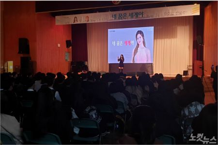 유명 유튜버 김아란이 27일 기장군 신정고 강당에서 '네 꿈은 세계야'를 주제로 강의하고 있다. (사진=VJ 이진우)