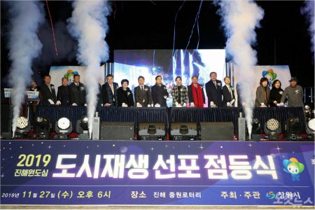 창원시가 27일 진해구 중원로터리에서 '진해 원도심 도시재생 선포 점등식'을 열고 진해 도시재생사업의 출발을 알렸다.