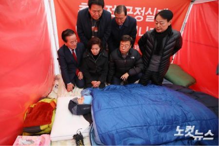 당내에선 최고위원 등 지도부를 포함해 의원들의 동조단식을 자원하는 요청이 쇄도하고 있다. 황 대표가 불을 지핀 투쟁의 동력을 살려나가기 위해 누군가는 황 대표가 머물던 청와대 앞 농성장에서 단식을 이어받아야 한다는 공감대가 형성됐기 때문이다.