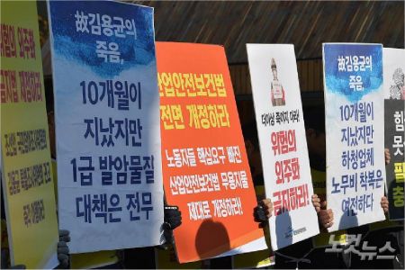 노동보건단체가 지난 달 27일 서울 광화문광장에 마련된 태안화력발전소 故 김용균 노동자 분향소 앞에서 태안화력발전소 고 김용균 사망 1주기 기자회견을 하고 있다.(자료사진=박종민 기자)