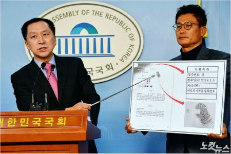 자유한국당 김기현 전 울산시장이 27일 국회 정론관에서 기자회견을 열고 자신이 경찰 수사를 받으면서 낙선했던 지난해 6·13 지방선거에 권력기관이 개입했다는 의혹을 제기하고 있다 윤창원기자