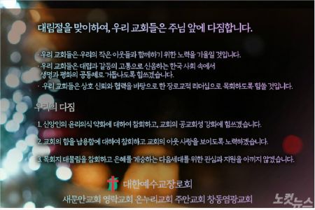 교회들은 “예수 그리스도의 오심을 기다리는 이 대림절에 우리의 허물과 연약함을 회개하며 새롭게 되길 결단한다”면서, “한국교회가 예수의 길을 온전히 따르며 하나님의 샬롬을 이 땅에 펼치는 생명과 평화의 공동체로 거듭나 교회를 교회되게, 신앙인을 신앙인답게 세워갈 것”을 다짐했다.