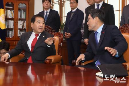 심재철 신임 자유한국당 원내대표, 오신환 바른미래당 원내대표가 9일 오후 서울 여의도 국회에서 열린 국회의장 주재 여야 3당 교섭단체 원내대표 회동에서 대화를 나누고 있다.