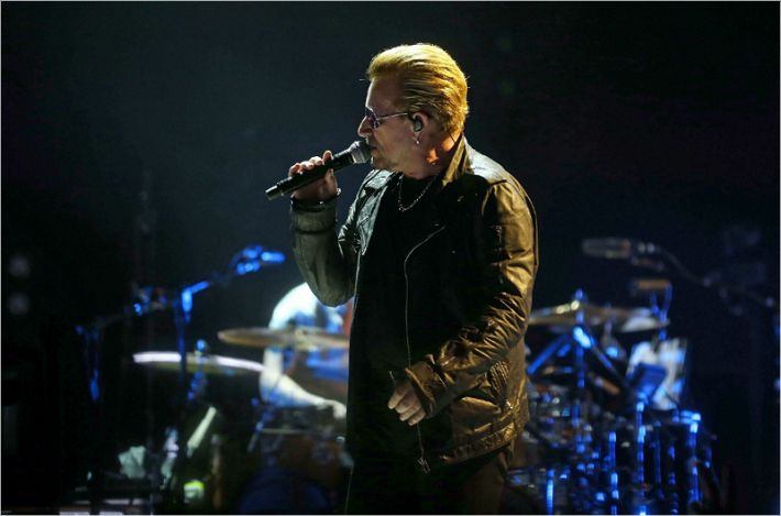 유명 로큰롤 음악 밴드 'U2'의 아일랜드인 리드보컬 보노가 노래를 부르고 있다.(사진=EPA/연합뉴스 제공)