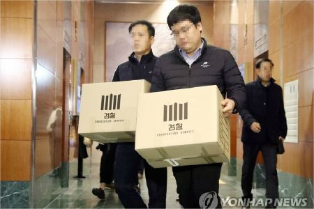 서울중앙지검 수사관들이 지난 6일 송병기 울산 부시장 집무실에서 압수수색한 후 물품을 박스에 담아 들고나오고 있다. 송 부시장은 이른바 '하명수사 의혹' 사건과 관련해 김기현 전 울산시장 측근 비리 의혹을 청와대 행정관에게 처음 제공한 인물이다. (사진제공=연합뉴스)
