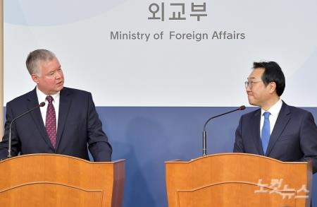 이도훈 외교부 한반도평화교섭본부장과 스티븐 비건 미국 국무부 대북정책특별대표가 16일 오전 서울 종로구 도렴동 외교부 청사 브리핑룸에서 기자회견을 하고 있다.