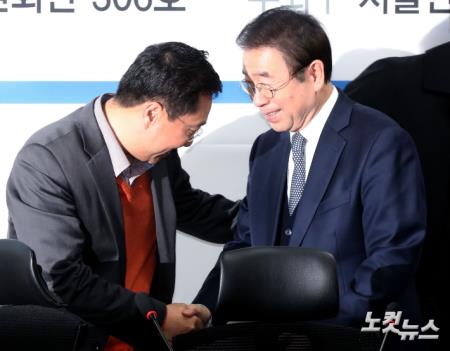 양정철 민주연구원장과 박원순 서울시장이 17일 오전 국회 의원회관에서 열린 불평등 해소를 위한 부동산 정책 개선방안 토론회에서 악수를 나누고 있다.
